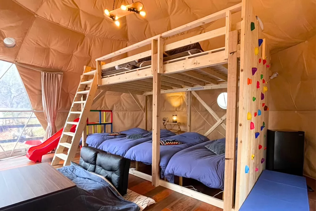 「雨が降ったらどうしよう…」なんて心配は無用! 室内キッズパーク付きの巨大ドームテントなら、 お部屋の中でも子供たちは元気いっぱい遊べます。🤸♂️ さらに、秘密基地みたいなロフト付き!