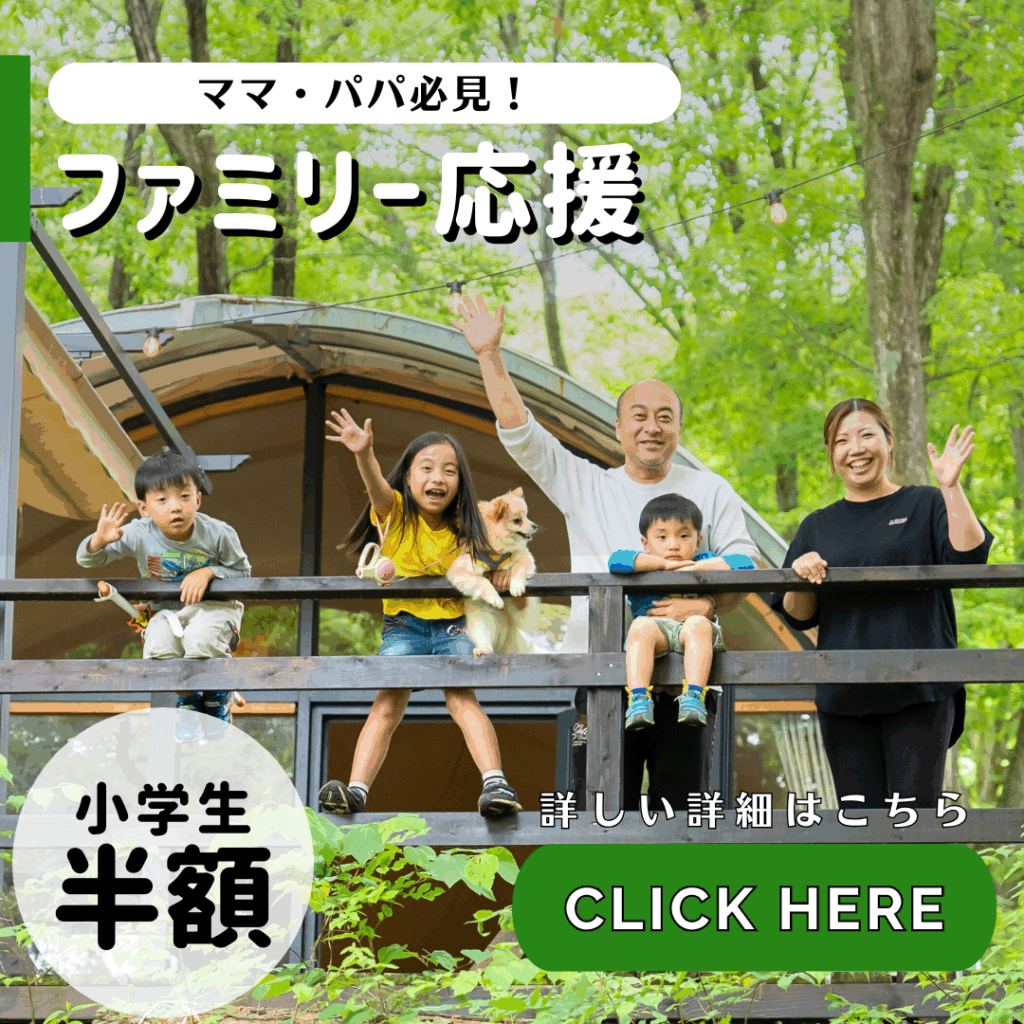\お子様がいるパパ・ママ必見!/ 1泊2食付きの宿泊で、 小学生以下のお子様はなんと「半額」 お得なプランが登場しました! お子様の宿泊費が半額だから、 お財布に優しく、普段体験できない アウトドア体験を楽しめます。 山 […]